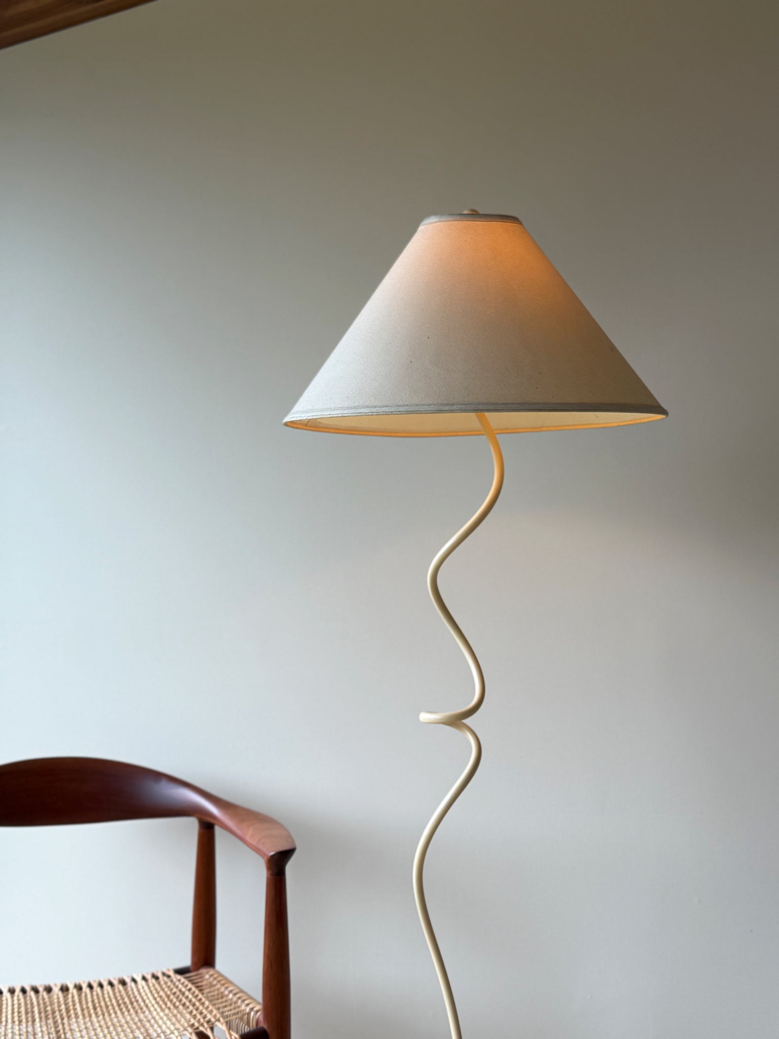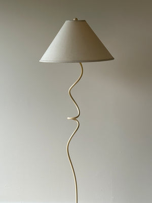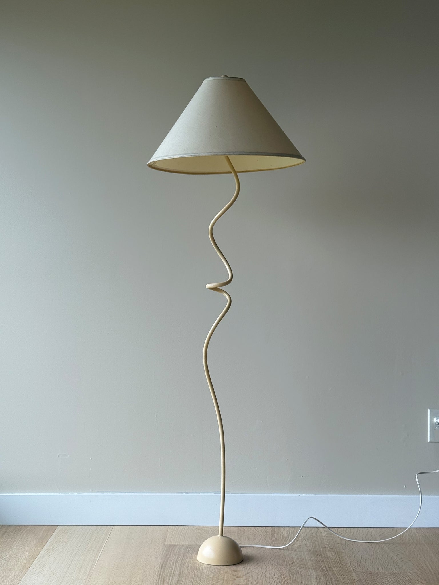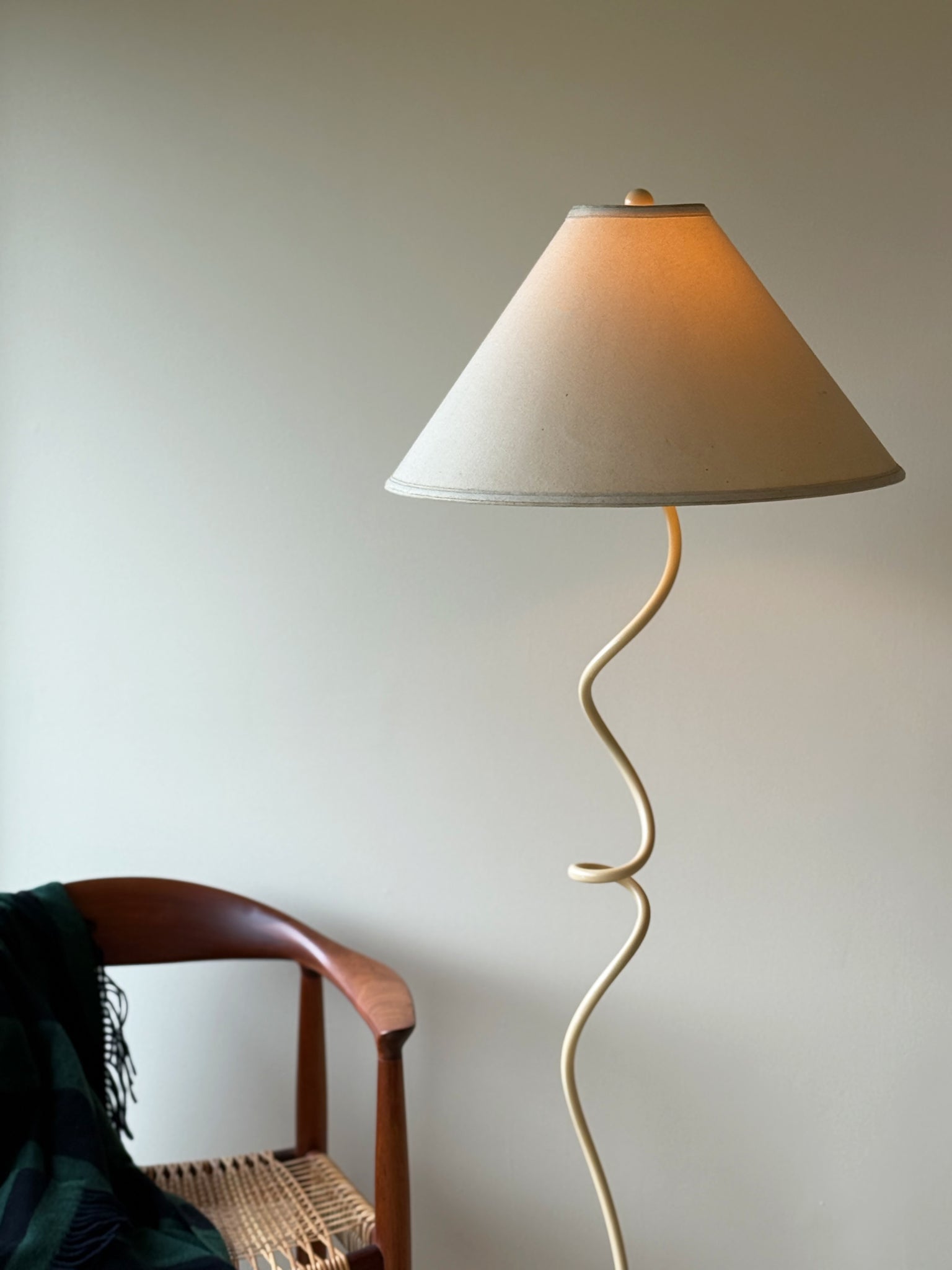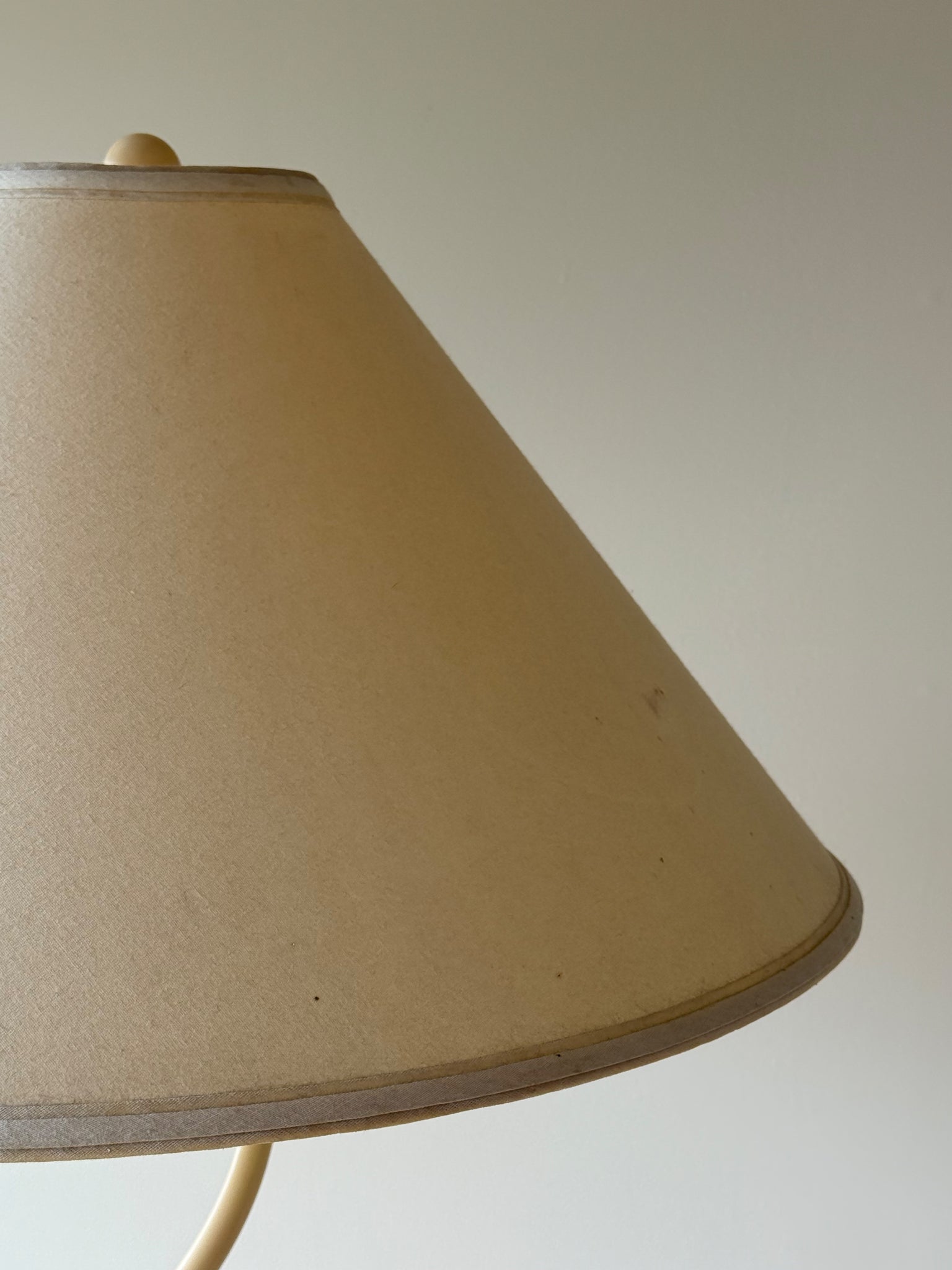 Vintage cream colored metal twisted floor lamp. Orginal shade with patina from age and use. Pretty cream color. White plug and on/off switch at head of lamp. Takes one E27 light bulb, not included. Tall, sleek and unique. Great vintage condition with signs of age and use. Shipping included at check out.