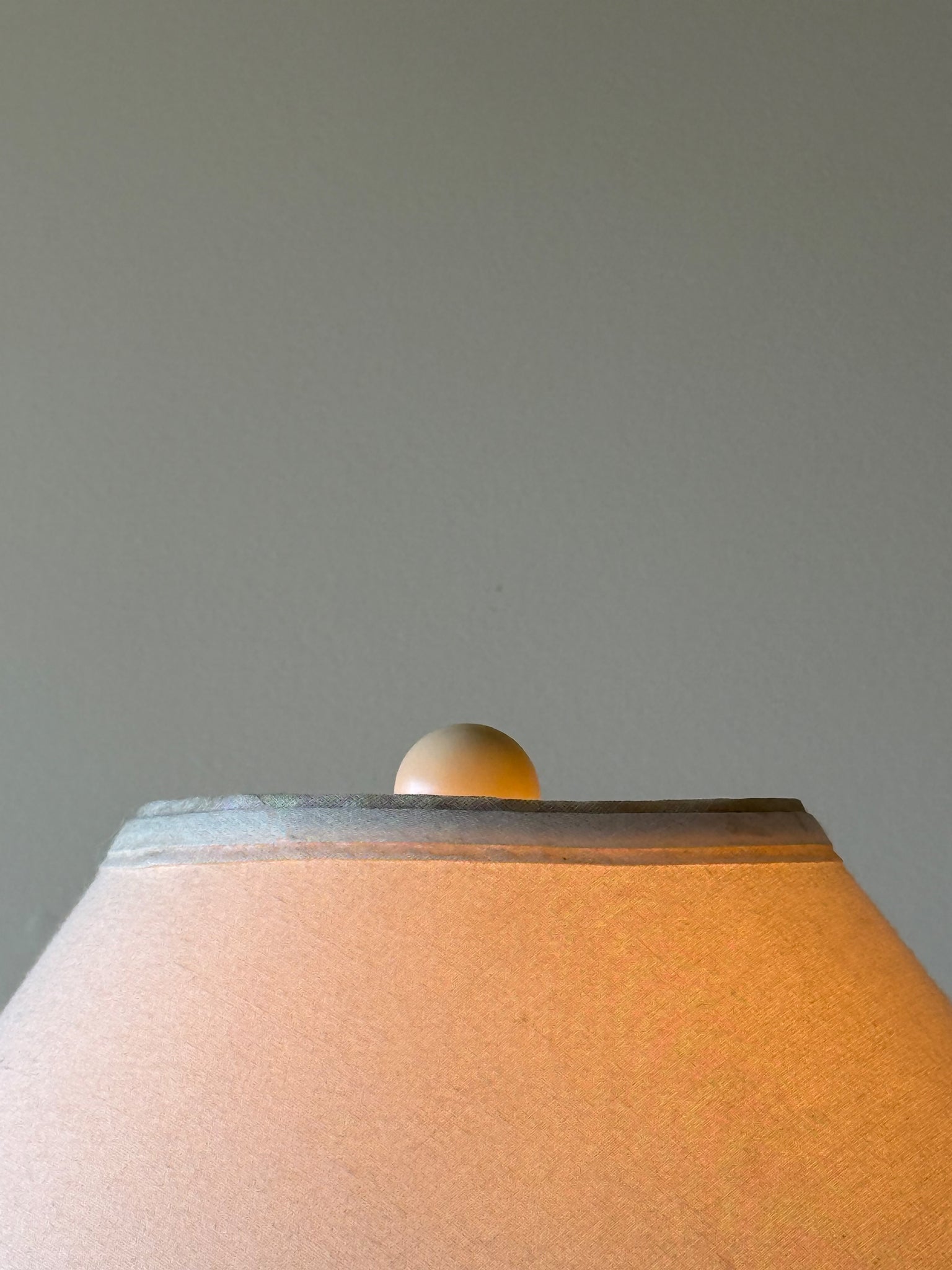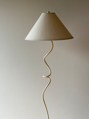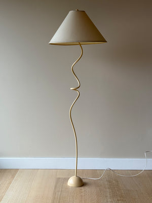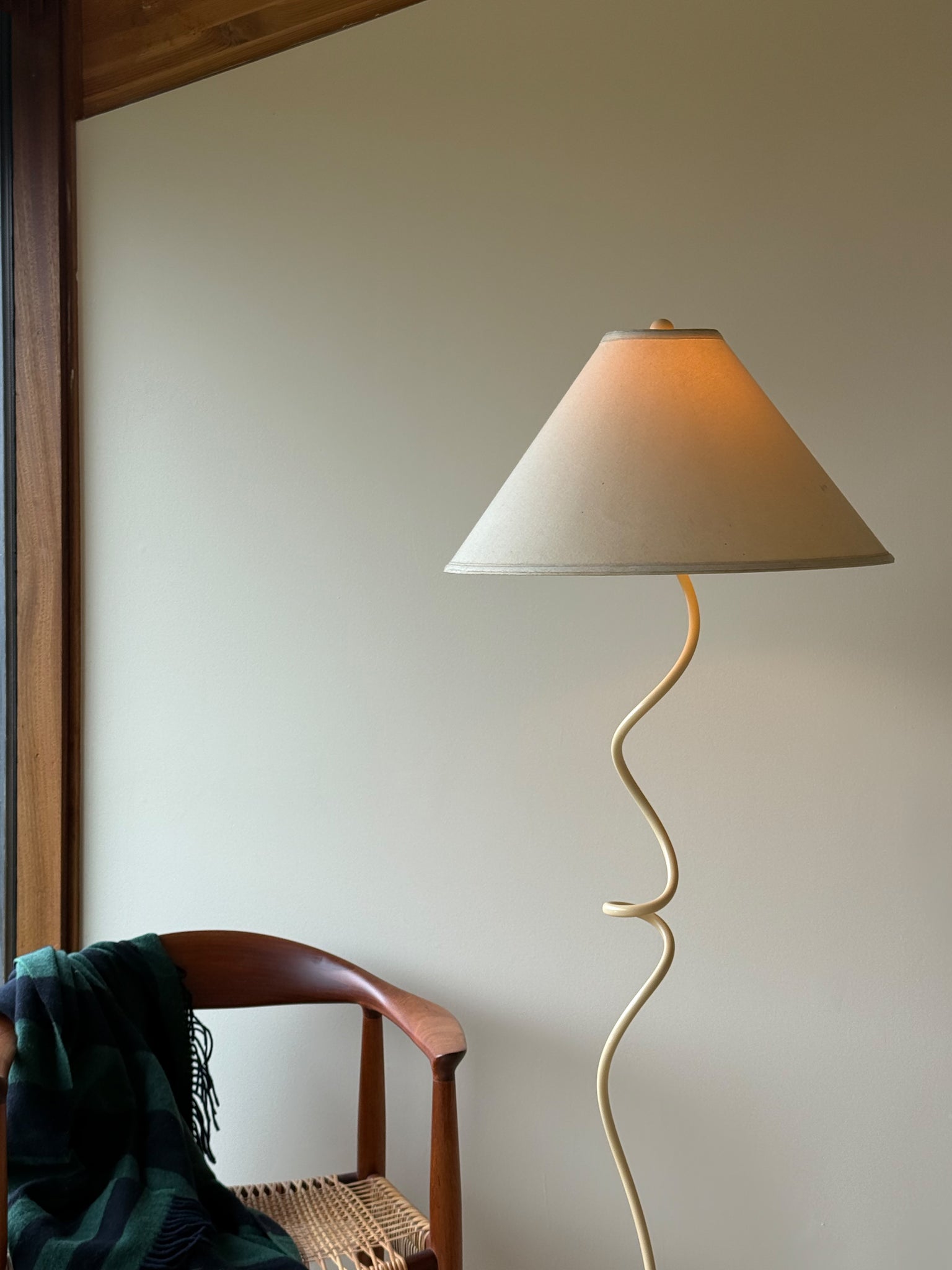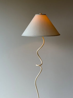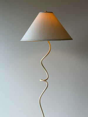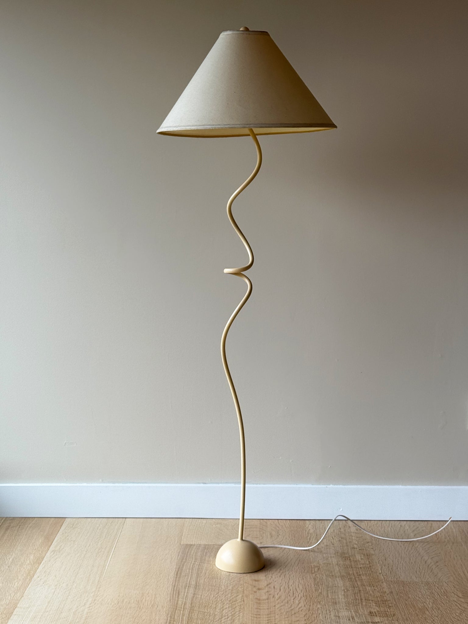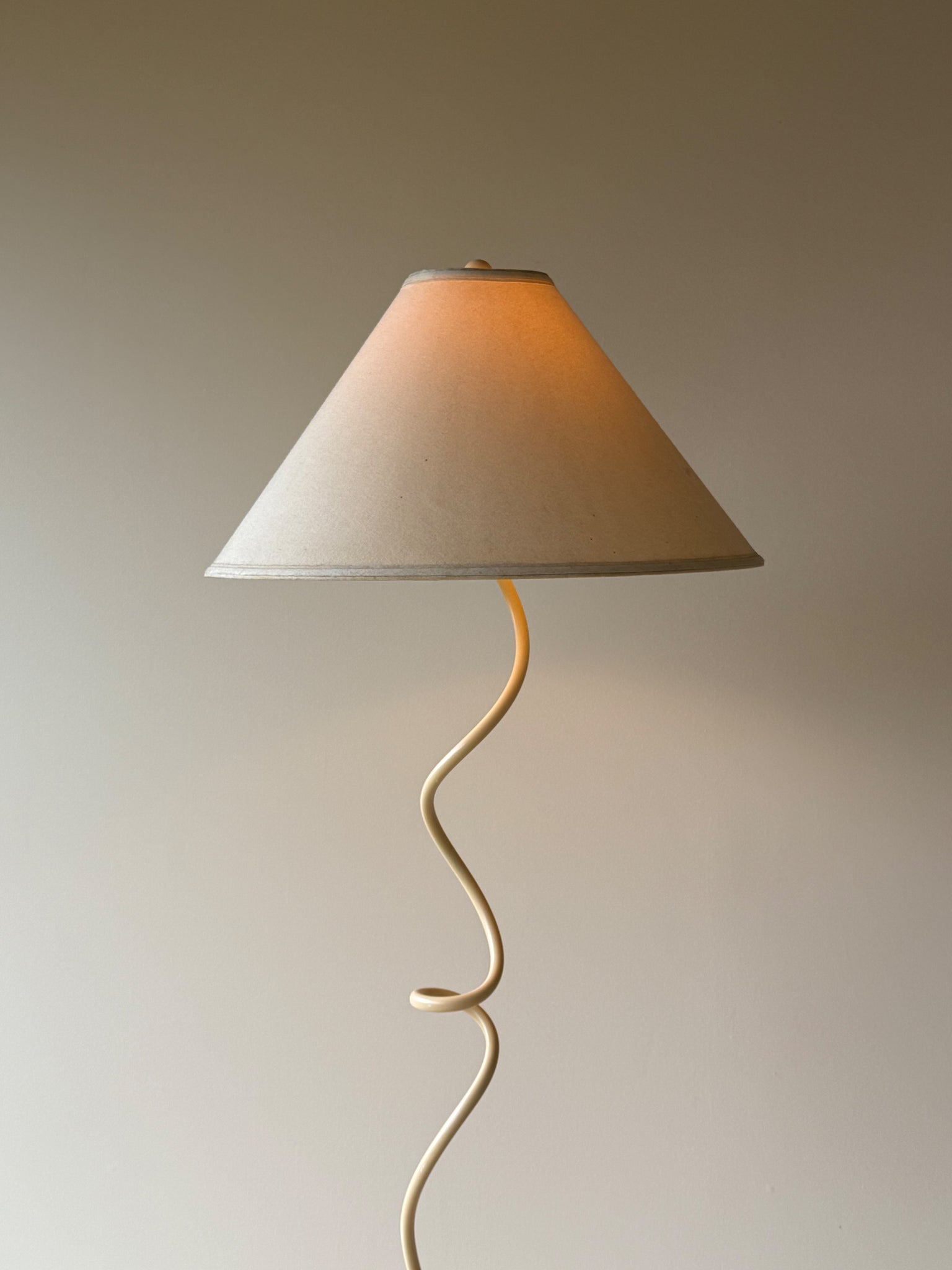 Vintage cream colored metal twisted floor lamp. Orginal shade with patina from age and use. Pretty cream color. White plug and on/off switch at head of lamp. Takes one E27 light bulb, not included. Tall, sleek and unique. Great vintage condition with signs of age and use. Shipping included at check out.
